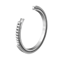 Solid inner/outer rings with rib-guided rollers, preventing friction and torque increase